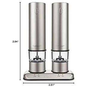 Detalhes Estes moinhos de sal e pimenta recarregáveis da Cuisinart são uma maneira fácil e elegante de servir sal e pimenta moídos na hora. Os moinhos têm uma base de energia elegante e estão sempre totalmente carregados. O LED acende quando eles estão carregando e quando estão prontos. Moinhos se ajustam para moagem fina a curso As luzes indicadoras de carga e pronto acendem quando no carregador Recipientes porta especiarias transparentes facilitam a verificação dos níveis de sal e pimenta em um relance Aço inoxidável escovado com logotipo Marca: Não Informado