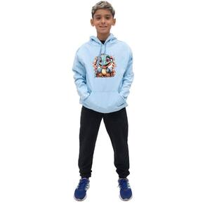 Conjunto de Moletom Canguru Infantil Menino Estampa de Dinossauro Com Calça Alta Qualidade - Azul Claro - 16