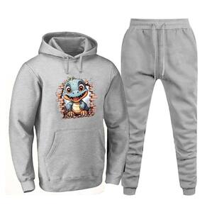 Conjunto de Moletom Estampa Dinossauro Canguru Com Calça Jogger Com Bolso e Elastico na Cintura - Cinza - GG