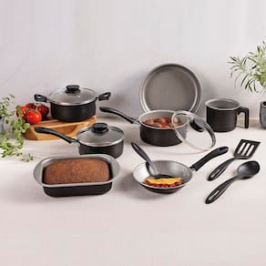 O Conjunto Tramontina Linz Starflon Max 10 Peças Preto + Faqueiro Leme 12 Peças Inox Vermelho. Não é só um kit completo, é um casamento perfeito, que une a resistência das panelas Tramontina com a funcionalidade e durabilidade dos talheres Tramontina Leme.