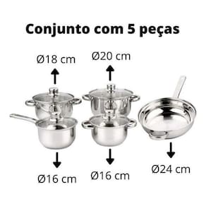 Jogo panela 5 peças tampa vidro aço inox wincy Esse conjunto de panelas inox 5 peças com tampa de vidro leva praticidade e beleza para a sua cozinha. Ideal para você, que não abre mão de funcionalidade e estilo. O produto é produzido em aço inox para maior resistência e durabilidade. Cabo em aço inox, tampas em vidro temperado. Fácil para limpar. Item incluso no pacote: 01 jogo de panelas inox 5 peças com tampa de vidro wincy Conteúdo da embalagem: 1 panela 16cm x 9,5cm - 1,5 litros 1 caçarola 16cm x 9,5cm - 1,5 litros 1 caçarola 18cm x 10,5cm - 2,2 litros 1 caçarola 20cm x 11,5cm - 3,2 litros 1 frigideira 24cm x 6,5cm - 2,5 litros - tampa de vidro com saída de vapor. - espessura do corpo: 0,3mm - espessura do fundo: 5mm Produto com garantia atendendo as normas padrão, marca renomada no setor. Indicada para todos os tipos de fogões, exceto cooktops por indução magnética