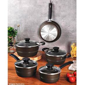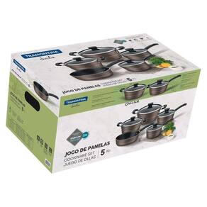 O Jogo de Panelas Tramontina Sicília em Alumínio com Revestimento Interno e Externo Antiaderente Starflon Excellent Avelã 5 Peças vai garantir uma cozinha equipada com utensílios de alta qualidade e eficiência! Suas peças são produzida em alumínio com revestimento interno e externo de antiaderente Starflon Excellent, características que proporcionam o cozimento uniforme dos alimentos, evita que eles grudem em sua superfície e as torna mais duráveis. Suas panelas e caçarolas vem com tampa de vidro temperado com saída de vapor e borda de aço inox e seus cabos, alças e pegadores são em material antitérmico e garantem um manuseio muito mais confortável e seguro. Elas ainda são fáceis de limpar e podem ir à máquina de lavar louças, otimizando sua rotina na cozinha!Recomendações: Antes do primeiro uso, lave com esponja macia, sabão neutro ou detergente líquido. Evite manchas não escorrendo gordura e alimentos na área externa da peça. O preparo de molhos e alimentos com forte pigmentação pode causar alteração na cor do revestimento interno. Limpeza: Evite a imersão do utensílio quente em água fria. Nunca utilize produtos abrasivos na lavagem. Para descarte dos produtos e embalagens siga as orientações de reciclagem vigentes. Este produto não necessita de manutenção, apenas limpeza. Conteúdo do jogo: 1 Panela 16 cm 1.3 litros 1 Panela 18 cm 1.9 litros 1 Caçarola 24 cm 4.3 litros1 Caçarola 20 cm 2.4 litros 1 Frigideira funda 24 cm 2.5 litros