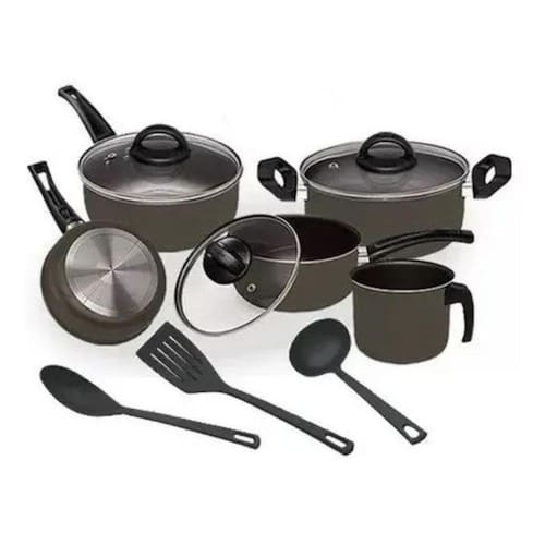 DescriçãoJogo de panelas 08 peças preto antiaderentes elegan tampa de vidroComposição:Panela 16Panela 18Caçarola 18Canecão 14Frigideira 18 s/ tampa3 utensílios diversosMarca: marpalMaterial: alumínio; teflon antiaderenteMaterial das tampas: alumínioMaterial dos utensílios: nylonMaterial alças e poméis: baqueliteEspessura: 1,0 mmCor: pretoImagens meramente ilustrativas. As tonalidades podem variar de acordo com seu monitor ou até mesmo com a percepção dos seus olhosO fabricante pode alterar detalhes de cor nos produtos sem aviso prévio