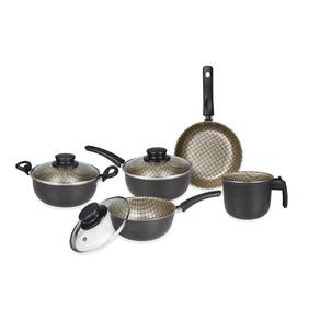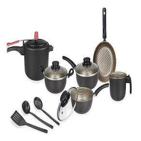 Toda cozinha parece renovada quando recebe um conjunto de panelas novo.O conjunto inclui 2 panelas com 16 e 18 cm , frigideira, fervedor, caçarola e panela de pressão, incluiu 3 utensílios para cozinha Espátula, pegador de macarrão e colher grande .As panelas são em alumínio com revestimento interno antiaderente que, além de facilitar a preparação de alimentos, torna a hora de lavar a louça uma tarefa mais simples. Possui revestimento externo de silicone, tampas de vidro com saída a vapor, cabos e alças anatômicos em baquelite antitérmicos e pegador da tampa antitérmicos.Revestimento interno antiaderente e externo de silicone, com tampa de vidro com saída de vapor.Elegância e modernidade para sua cozinhaEspecificaçõesPeso conjunto : 2,8 kgCor: Creme DecoradoItens Inclusos:01- Panela de 16cm de diâmetro01- Panela de 18cm01- Caçarola de 18cm01- Fervedor de 14cm01- Frigideira de 20cm01- Panela de Pressão 4,5L01- Espátula01- Pegador de macarrão01- Colher Grande