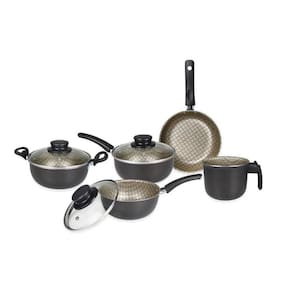 Toda cozinha parece renovada quando recebe um conjunto de panelas novo.O conjunto inclui 2 panelas com 16 e 18 cm , frigideira, fervedor, caçarola e panela de pressão, incluiu 3 utensílios para cozinha Espátula, pegador de macarrão e colher grande .As panelas são em alumínio com revestimento interno antiaderente que, além de facilitar a preparação de alimentos, torna a hora de lavar a louça uma tarefa mais simples. Possui revestimento externo de silicone, tampas de vidro com saída a vapor, cabos e alças anatômicos em baquelite antitérmicos e pegador da tampa antitérmicos.Revestimento interno antiaderente e externo de silicone, com tampa de vidro com saída de vapor.Elegância e modernidade para sua cozinhaEspecificaçõesPeso conjunto : 2,8 kgCor: Creme DecoradoItens Inclusos:01- Panela de 16cm de diâmetro01- Panela de 18cm01- Caçarola de 18cm01- Fervedor de 14cm01- Frigideira de 20cm01- Panela de Pressão 4,5L01- Espátula01- Pegador de macarrão01- Colher Grande