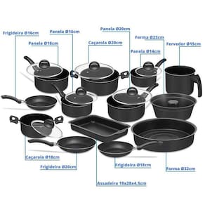 -conjunto composto por 13 panelas antiaderentes. -panelas leves e ideais para transportar. -material de alumínio para cozimento rápido e eficiente. -cabos de baquelite para segurança e conforto. -diversas peças, incluindo panelas, frigideiras e formas.
