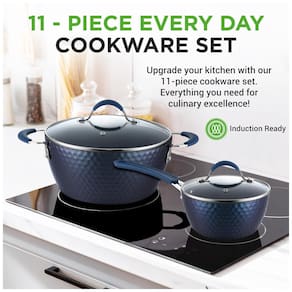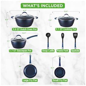 CONJUNTO DE 11 PEÇAS NutriChef oferece um conjunto de panelas antiaderente de 11 peças que inclui 1. panela de 6.6L com tampa, 3. panela holandesa de 5.6L com tampa, 2. panela de 1L com tampa, frigideira grande de , frigideira pequena, concha de sopa, garfo de macarrão e espátula REVESTIMENTO ANTI COLANTE Os utensílios de cozinha do conjunto de panelas antiaderente apresentam um revestimento antiaderente durável e de longa duração para facilitar o lançamento, limpar e cozinhar de forma saudável. Possui exterior de cerâmica de diamante azul que torna o pote mais durável e com melhor transferência de calor PEGAS DE PEGA DE SILICONE TOUCH Este conjunto de panelas possui alças ergonômicas de toque frio e também resistentes ao calor, o que garante um cozimento confortável e . Oferece um padrão de linha de diamante elegante e moderno, adicionando um toque moderno e moderno aos tachos e panelas TAMPA VER ATRAVÉS A panela antiaderente está equipada com tampas transparentes de vidro temperado com orifícios de ventilação que permitem a saída do vapor. O conjunto de panelas distribui e retém efetivamente o calor para cozinhar uniformemente com temperatura máxima de 260 C INDUÇÃO PRONTA Essas frigideiras e frigideiras são seguras para uso em balcões a gás, elétricos, de cerâmica e de indução. Feito de alumínio forjado reforçado com espessura de revestimento de 25 35um, 3, multicamadas. Inclui utensílios de silicone de nylon resistente ao calor. Basicamente, você pode usá los em qualquer lugar