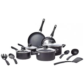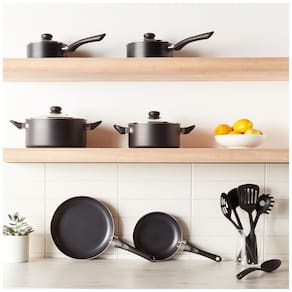 Corpo em alumínio com revestimento antiaderente para facilitar o cozimento e a limpeza Livre de BPA. As alças confortáveis de toque suave mantêm se frescas durante o uso, as tampas de vidro ventiladas permitem que o vapor escape. O fundo espiral aquece uniformemente compatível com fogões a gás, elétricos e de vidro nota não compatível com indução. Lavar à mão apenas, não lavável na máquina de lavar louça verifique o tamanho das placas do seu fogão antes de comprar. Por favor, use fogo baixo a médio temperatura extremamente alta pode causar danos ao manípulo e ao revestimento