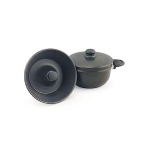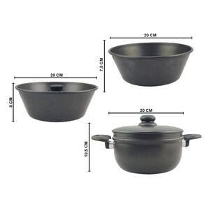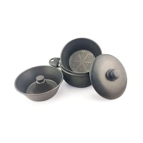 O conjunto de panelas Banho Maria da Dona Chefa é composto por 4 peças que podem ser utilizadas juntas ou de forma separadas, as peças são uma panela base, uma forma, um escorredor e uma tampa, todas as peças do conjunto são de alumínio com revestimento antiaderente e seus cabos e pegadores em baquelite com alta resistência ao calor. Este kit é ideal para cozinhar bolos, pudim, cuscuz, legumes no vapor, macarrão entre outros preparos.