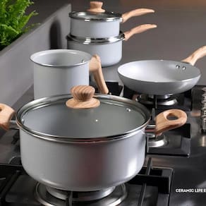 O conjunto de panelas Ceramic Life Easy 5 peças brinox smart plus ceramic life é um jogo de utensílios domésticos que oferece durabilidade, beleza e praticidade hora de cozinhar. As panelas são feitas de alumínio com revestimento cerâmico antiaderente, que não libera metais pesados e elementos químicos no alimento. Elas também possuem tampas de vidro temperado com saída de vapor e alças e cabos em soft-touch antitérmico, que não esquentam e garantem um manuseio seguro e confortável. Além disso, elas são resistentes a altas temperaturas e podem ser usadas em fogões a gás, elétricos e vitrocerâmicos. O conjunto de panelas Gris 5 peças brinox smart plus ceramic life é uma ótima escolha para quem busca qualidade, economia e sofisticação cozinha. Com ele, você pode preparar refeições saborosas e nutritivas para toda a família.
