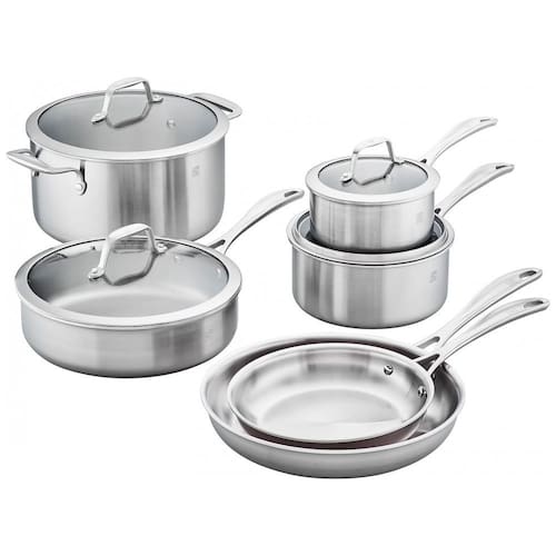 O conjunto inclui frigideira de 8 , frigideira de 10 , panela de 1 L com tampa, panela de 2L com tampa, panela de refogado de 3L com tampa e forno holandês de 6L com tampa. Construção de 3 camadas, do aro ao aro , o núcleo de alumínio espesso conduz o calor de maneira rápida e uniforme. Puxadores grandes e fáceis de manter, projetados para facilitar manobras e controle enquanto usam luvas de forno. Jante queimada para vazamento limpo e sem gotejamento. Tampa de vidro temperado para facilitar o monitoramento do cozimento. Forno até 260 C , revestimento e tampas de vidro 204 C. Máquina de lavar louça segura. Compatível com fogão a gás, indução, cerano, halogênio e elétrico
