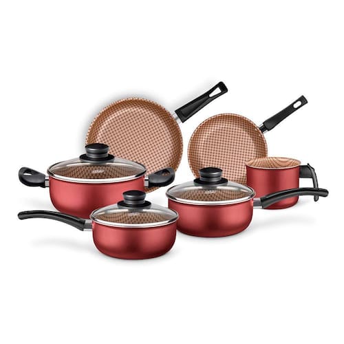 Linha: CONJUNTO FLORA COM TAMPA DE VIDRO 6 PEÇAS - DE ALUMÍNIO COM ANTIADERENTE COR CEREJA Marca: MTA Peças: 6 Cor: Cereja Material: Alumínio Revestimento: Antiaderente Superflon Ultra Espessura Superior: 1,60mm Cabos: Em baquelite/antitérmicos Tampas: Vidro Temperado/Aro Aço Inox/ Com saída a vapor Dimensões aproximadas da embalagem: 14 x 63 x 47 cm (A x L x P) Peso aproximado da embalagem: 4,10 Kg Informações Adicionais: Design moderno
