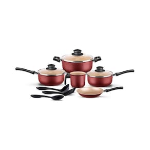 Para deixar a sua cozinha ainda mais bonita e funcional, garanta as peças da Linha Seletta, com composição em alumínio, espessura de 1,2mm e cozimentos muito mais práticos. Sem contar toda a durabilidade dos itens, unida a um design atemporal e elegante. Pegadores, cabos e alças feitos de baquelite antitérmico garantem maior segurança durante o manuseio, evitando que você se queime. A MTA criou a Linha Seletta para apresentar ao mercado um conjunto de itens especialmente pensados para a sua cozinha, se adaptando ao seu cotidiano enquanto ainda mantém a qualidade. Lembrando que aconselhamos a não usar as panelas sem óleo. Também deve-se evitar o uso de utensílios de metal em atrito com a panela, podendo danificar o revestimento da mesma - prefira nylon, silicone ou madeira. Características: Marca: MTA Código do Fabricante: 8834 Linha: Seletta Cor: Cereja Material: Alumínio Material da Alça/Pegador: Baquelite Material dos Utensílios: Nylon Antiaderente: Sim Espessura: 1,2mm Fogões Compatíveis: Gás, elétrico e vitrocerâmico Conteúdo: 1 Caçarola 20cm, 1 Colher, 1 Concha, 1 Espátula, 1 Fervedor 12cm, 1 Frigideira Francesa 18cm, 1 Panela 16cm e 1 Panela 18cm Compatível com Lava-louças: Sim Material das Tampas: Vidro temperado Saída de Vapor: Sim