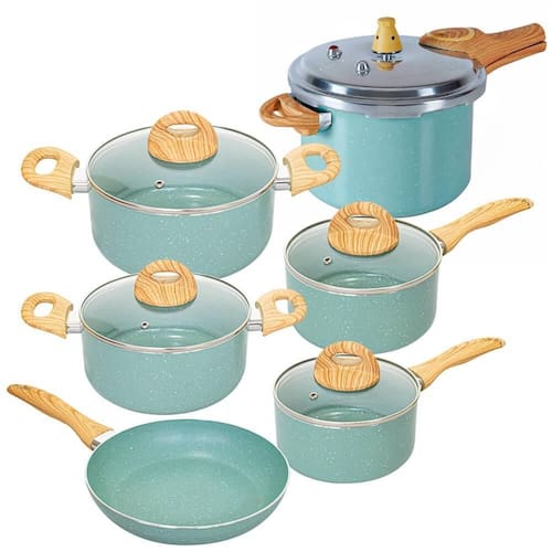 O jogo de panelas possui design inovador, produzida na cor verde com cabos amadeirados, o que com certeza é um diferencial quando estão expostas.