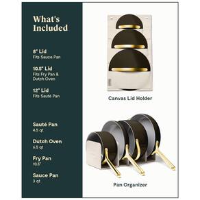 O conjunto de 12 peças inclui uma frigideira de 10,5 polegadas, uma panela com tampa de 2,80 litros, um forno holandês com tampa de 6,06 litros, uma frigideira com tampa, 4 grelhas magnéticas modulares e um suporte para tampa de lona com ganchos. Aproveite para intensificar seu jogo de panelas e frigideiras e enfeitar a decoração da sua cozinha com os conjuntos de panelas e frigideiras da Caraway.