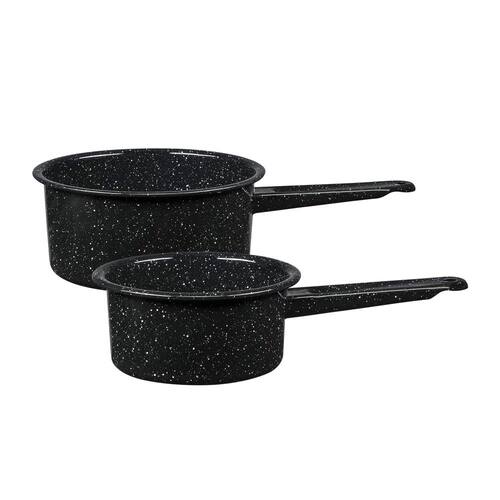 This Saucepan Set comes in 1-Quart and 2-Quart and is a versatile and essential tool in any kitchen, perfect for preparing a variety of dishes such as sauces, soups, or boiling water for quick meals. Built with a robust low-carbon steel core, this granite saucepan is designed for durability and reliable performance, even with everyday use. The porcelain surface is fused to the steel, creating a non-porous, scratch-resistant finish that’s both durable and easy to maintain. With its dark porcelain exterior, this essential saucepan heats up quickly and distributes heat evenly across your food, making it an efficient choice for consistent cooking results. Whether you're simmering a delicate sauce or preparing a quick soup, the non-stick pot ensures your ingredients are cooked to perfection without sticking or burning. The speckled black finish adds a classic look to your cookware collection, enhancing your kitchen with a timeless aesthetic. Meanwhile, the non-stick porcelain surface allows for easy food release, so you won’t need to worry about extra oils or fats during cooking, and cleanup is quick and simple. This non-toxic cookware is free from harmful chemicals like PFOAs, ensuring that your meals are both healthy and flavorful. Although ideal for most stovetops, this graniteware saucepan is not recommended for glass cooktops. Their compact sizes make it a versatile addition to your cookware essentials, perfect for batches and everyday use. Combining style, durability, and efficient heating, this Saucepan is a must-have for any kitchen looking for reliable, chemical-free cookware.