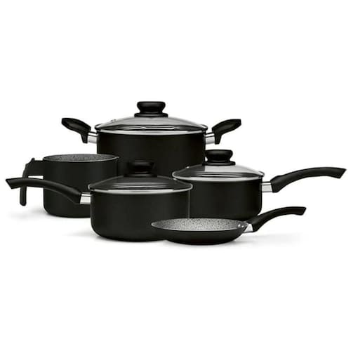 O conjunto de panelas Maximum Stone Plus da Panelux, com 5 pecas na cor verde, e fabricado em aluminio de alta qualidade e revestimento antiaderente.