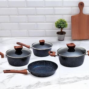 Conjunto é composto por quatro peças essenciais para o dia a dia, sendo uma caçarola com tampa ideal para ensopados e cozidos, uma panela com tampa perfeita para arroz, molhos e refogados, outra panela com tampa para preparos diversos e uma frigideira excelente para grelhados e frituras leves, compatível com todos os tipos de fogão, incluindo gás, elétrico, indução e vitrocerâmico