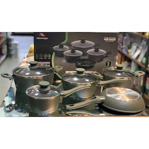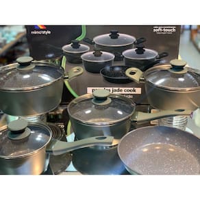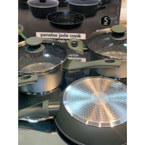 Conjunto de panelas revestimento cerâmico jade - mimo stylen conjunto de panelas revestimento cerâmico jade - mimo styleCaçarolaTam: 24 x 10,5 cmCapacidade: 3,68lPeso: 1500 gCaçarolaTam: 20 x 9,5 cmCapacidade: 2,2 lPeso: 1080gPanelaTam: 16 x 8,5 cmCapacidade: 1,3 lPeso: 767gPanelaTam: 20 x 9 cmCapacidade: 2,25 lPeso: 1050gFrigideiraTam: 24 x 5,5 cmCapacidade: 1,6 lPeso: 618gFundo tripla induçãoVidro temperado com saída para vaporCabos e alças com revestimento soft-touch super macioEstrututa de alumínio revestida em cerâmicaEconomiza energia e cozinha mais rápidoAntes do primeiro usoRetire os pláticos, etiquetas e adesivos. Lave o produto com água morna e uma esponja macia om sabão neutroou detergente. Enxágue bem. Unte a parte interna com óleo ou qualquer outro tipo de gordura. Leve o produto ao fogo baixo até aquecer o conteúdo e deixe esfriar. Descarte o conteúdo e repita a lavagem se secagem para eliminar qualquer resíduo. Seu produto está pronto para uso.Durante o usoPara melhorar a eficiência do antiaderente, pré-aqueça o produto antes de colocar o alimento. A temperatuda ideal para isso é de 120c . Não permita que super aqueça vazia, isso pode prejuldicar a camada antiaderente, diminuindo sua eficiência, ou danificar o produto. Manteha a quantidade de alimento até no máximo 2/3 da capacidade do seu produto . Ao cozinhar ultilize sempre fogo baixo e moderado, permitindo que o produto se aqueça gradualmente. Graças a condutibilidade de calor rápida e eficiente do aluminío, cozinhar em temperatura baixa ou média é sulficiente, reduz o consumo de energia. Nunca ultilize o produto na chama cujo o diâmetro seja maior que o diâmetro do fundo. Nunca arraste ou deslize sobre uma superficíe irregular, pois dessa forma você poderá danificar o fundo. Como o aluminío é um bom condutor de calor, o produto pode ficar muito quente durante o cozimento. Portanto, é aconselhavel o uso de proteções como luvas ou pegadores durante o manuseio.Após o usoEvite choques térmicos. Sempre deixe o produto esfriar completamente antes de colocar na água. É muito simples manter seu produto limpo e conservado. Basta lavá-lo a mão, com água morna e uma esponja macia, com sabão neutro ou detergente. Em seguida enxágue e seque bem com um pano macio para não danificar. Para remover alimentos queimados, deixe o produto imerso em água por alguns minutos. Se for necessário esfregar, use materiais não abrasivos. Nunca ultilize utensílios metálicos, objetos afiados ou produtos abrasivos.