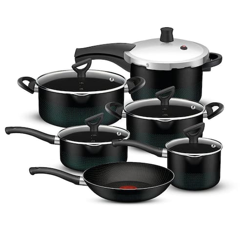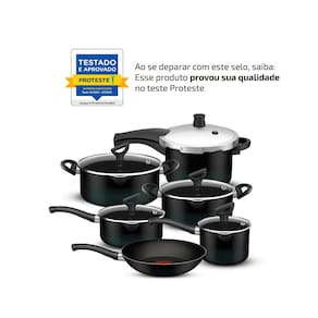 Composto por uma caçarola de 20cm, uma caçarola de 22cm, uma frigideira francesa de 22cm, uma panela multifuncional de 14cm, uma panela de 18cm e uma panela de pressão de fechamento externo revestida de 4,5L.