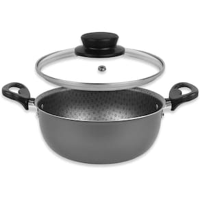 Conjunto de panelas com revestimento antiaderente é para quem gosta de praticidade, os alimentos não grudam na panela proporcionando facilidade também na limpeza. Proporciona um cozimento rápido e uniforme e pode ser utilizada no fogão à gás ou elétrico. As panelas têm um revestimento interno antiaderente resistente à abrasão, que serve como uma aderência em qualquer superfície e propaga o calor com maior eficiência. Possui tampa de vidro temperado de alta resistência com saída de vapor e alças anatômicas facilitando o manuseio.