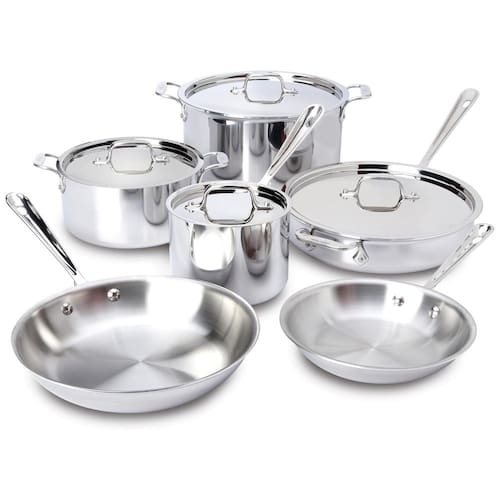 O conjunto inclui frigideiras de 20 e , panela de molho de 2 litros com tampa, caçarola de 3 litros com tampa, frigideira de 3 litros com tampa e panela de 8 litros com tampa Construção clássica de três camadas, feita com um núcleo de alumínio responsivo unido com 2 camadas de aço inoxidável durável em toda a volta para máxima durabilidade e distribuição de calor rápida e uniforme Protegido com alças de aço inoxidável rebitadas para garantir uma aderência segura e adicionar um pouco de estilo com tampas de aço inoxidável para combinar Compatível com todos os cooktops, incluindo indução, e para forno e frangos de corte até 315 C