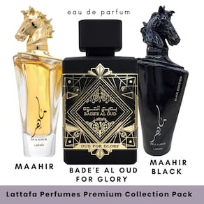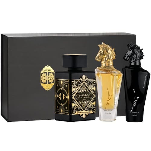 Conjunto de presente Lattafa for Unissex de 3 peças de Eau de Parfum (Bade'e Al Oud Oud for Glory + Maahir Black Edition para homens) 3,4 onças/100 ml cada — O conjunto contém — Lattafa Bade'e Al Oud Oud for Glory for Glory para spray unissex Eau de Parfum de 3,4 onças — Lattafa Maahir para água unissex Spray de Parfum de 3,4 onças — Lattafa Maahir Black Edition para homens Eau de Parfum Spray de 3,4 onças — de longa duração
