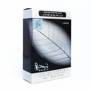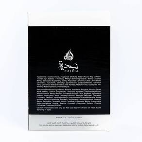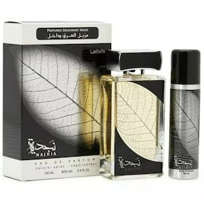 Conjunto de 2 peças Lattafa Najdia para homens (spray Eau de Parfum de 3,4 onças mais 1,7 onças de spray desodorante) - O conjunto inclui: - 3,4 onças de spray Eau de Parfum Najdia - 1,7 onças de spray desodorante Najdia - Notas principais: toranja, mandarim. - Notas de coração: notas de especiarias, rosa, canela - Notas de base: âmbar, couro, patchouli, notas amadeiradas