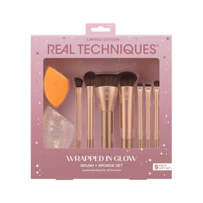 — o conjunto de presentes Real Techniques Wrapped In Glow inclui: pincel de fixação 402, escova facial 200 Expert, 261 pincel Snatch + Sculpt, 324 pincel de sombra angular, 332 pincel Smudge, 356 pincel angular, 7 Shading Brush, Miracle Complexion Sponge e Sponge Case — O conjunto de presente de Natal de edição limitada contém 7 pincéis de maquiagem que podem ser utilizados com base líquida, creme e pó,