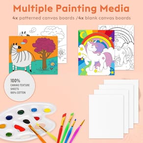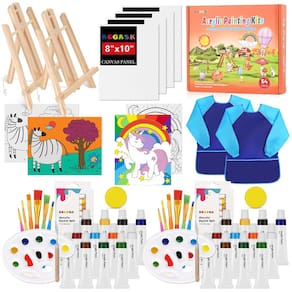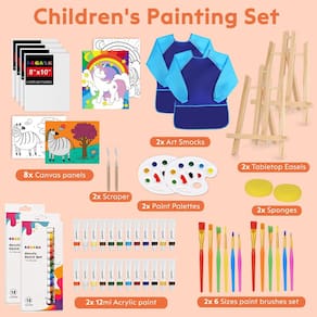 Materiais de arte para crianças – Conjunto de pintura de 54 peças Liberte a criatividade do seu filho com este conjunto de pintura infantil definitivo. Perfeito para incentivar brincadeiras imaginativas, é ideal para artes e artesanato para crianças de 8 a 12 anos, proporcionando horas de diversão artística. - Conjunto completo de tintas para crianças: Este conjunto de 54 peças inclui tudo o que os jovens artistas precisam: 8 painéis de tela (4 estampados, 4 em branco), 2 conjuntos de 12 tintas acrílicas vibrantes (12 ml cada), 2 conjuntos de 6 pincéis em vários tamanhos, 2 paletas de tinta, 2 paletas de arte, 2 cavaletes de mesa, 2 raspadores e 2 esponjas. Se você está procurando kits de pintura para crianças de 4 a 8 anos ou materiais de arte para crianças de 9 a 12 anos, este conjunto tem tudo! - Perfeito para Little Picassos: com telas estampadas e em branco, as crianças podem pintar livremente ou seguir desenhos divertidos. O conjunto é ideal para nutrir a criatividade das crianças e fornecer-lhes as ferramentas para expressar sua imaginação. - Materiais de alta qualidade, adequados para crianças: feito de materiais não tóxicos, este conjunto de pintura infantil é seguro para jovens artistas e inclui jalecos para minimizar a bagunça. É projetado para fornecer uma maneira divertida e segura de explorar a pintura. - Promove o desenvolvimento criativo: ótimo para desenvolver habilidades essenciais como coordenação motora e motora fina, este kit de pintura para crianças de 8 a 12 anos apoia o aprendizado e a exploração criativa. - Um presente de Natal perfeito para crianças: Procurando presentes de Natal para crianças? Este conjunto de pintura infantil é um presente ideal para jovens criativos. Seja para presentes de Natal para crianças ou diversão criativa todos os dias, esta é uma ideia de presente atenciosa e envolvente para aniversários, feriados ou ocasiões especiais.