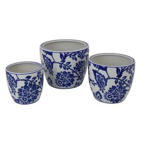 plantadores de jardim, padrão floral de cerâmica japonesa branca e azul - Conjunto de três vasos