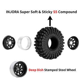 Especificações do aro: Número da peça: W1004 Material: Aço Deslocamento: -3,78 mm (-0,15") Diâmetro externo: 27 mm (1,06 pol.) Largura: 14 mm (0,55 pol.) Cubo da roda: 7 mm (0,28 pol.) Cada peso: 15 g/pcs (15 g) Especificações do pneu Número da peça: T1014 Composto: INJORA S5 (super macio e pegajoso) Material: borracha Diâmetro externo: 62 mm (2,44 pol.) Largura: 22 mm (0,87 pol.) Peso de cada pneu: 15 g Conteúdo da embalagem: 4 aros de carro RC de 2,54 cm (1") 4 pneus RC Car 1" - Deslocamento negativo - aros de roda de 3,78 mm, maior espaçamento entre os cubos para maior estabilidade. - Feito de roda de aço estampado de alta qualidade, melhora o desempenho geral no manuseio e durabilidade. - Pneus Crawler de 62 x 22 mm, feitos com o composto INJORA S5 super macio e pegajoso. - Estrutura de dobra de viés resistente para excelente durabilidade e flexibilidade de piso. - Bom tamanho para 1/18 1/24 RC Crawler Car Axial SCX24 FMS FCX24 TRX4M.
