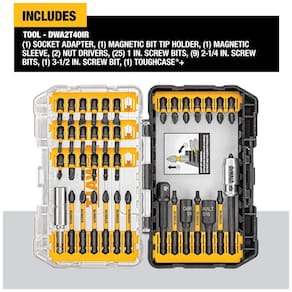 Sistema de zenamento de acessórios conectável para otimizar o espaço de zenamento do conjunto de brocas O design de barra de bits patenteado do conjunto de bits DEWALT permite fácil remoção de bits e colocação personalizável A tampa transparente do conjunto de bits do driver permite que você veja facilmente o conteúdo de relance Trava de clipe para fechamento O tamanho de zenamento a granel pequeno cabe dentro do Small e Medium ToughCase plus vendido separadamente Ideal para organizar bits soltos Ponta de broca usinada em CNC para ajuste preciso nas cabeças dos parafusos para reduzir a saída do came A zona FlexTorq estendida transfere o torque ideal A luva Magnetic Screw Lock minimiza as quedas e reduz as oscilações Marca: Não Informado