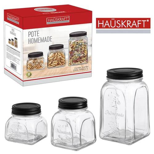 Conjunto de pote de vidro quadrado homemade com tampa hermetica de metal preto hauskraft 3 pecas Ean: 7896980462081 Validade: indeterminada Capacidade: 250ml, 500ml e 1l Tamanho aproximado: 1 pote - 8,4x8,2cm 1 pote - 11,5x8,9cm 1 pote - 16,9x9,9cm Tamanho aproximado da caixa: a:21xl:20xp:10,5cm Peso aproximado: 1315g Tipo de produto: conjunto de pote quadrado homemade com tampa hermetica hauskraft 3 pecas Cor: transparente com tampa preto Composição: vidro e metal