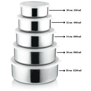 Dimensões e Capacidades: Pote 1: 4 cm x 10 cm A x D , capacidade 250 ml, peso 35g Pote 2: 4,5 cm x 12 cm A x D , capacidade 450 ml, peso 50g Pote 3: 5 cm x 14 cm A x D , capacidade 700 ml, peso 60g Pote 4: 6 cm x 16 cm A x D , capacidade 1 L, peso 80g Pote 5: 6,5 cm x 18 cm A x D , capacidade 1,4 L, peso 99g