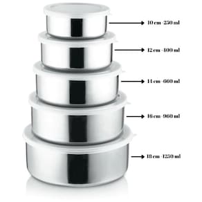Dimensões e Capacidades: Pote 1: 4 cm x 10 cm A x D , capacidade 250 ml, peso 35g Pote 2: 4,5 cm x 12 cm A x D , capacidade 450 ml, peso 50g Pote 3: 5 cm x 14 cm A x D , capacidade 700 ml, peso 60g Pote 4: 6 cm x 16 cm A x D , capacidade 1 L, peso 80g Pote 5: 6,5 cm x 18 cm A x D , capacidade 1,4 L, peso 99g