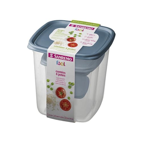 Conjunto de potes sanremo 4 peças Moderno e arrojado. Vão ao freezer, micro-ondas e lava-louças. Pegadores laterais que facilitam o manuseio do pote quando aquecido ou em baixa temperatura. Tampa com saliências nas extremidades que facilitam a abertura do produto. Linhas de graduação de volume que facilitam o controle da quantidade de alimento armazenado. Atóxico. Bpa free. Contém: 1 pote 4,5l / 1 pote 1,7l / 1 pote 800ml / 1 pote 200ml Cor: azul Material: plástico Medidas: 19cm comp. X 17cm alt. X 19cm larg. Peso: 0,358kg