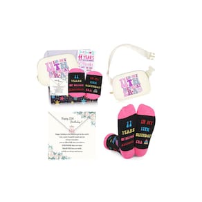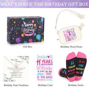 Nossas caixas de presente são lindamente projetadas e cada presente é cuidadosamente colocado como um tesouro precioso esperando para ser descoberto. Todos estes são cuidadosamente projetados, presentes de aniversário para meninas, irmãs, filhas, sobrinhas, irmãs, amigas, filhas, para fazer as pessoas abrirem o momento e se sentirem cheias de surpresa e calor. - Presentes de aniversário para meninas: nossas caixas de presente são lindamente projetadas e cada presente é cuidadosamente colocado como um tesouro precioso esperando para ser descoberto. Todos esses presentes de aniversário para meninas são cuidadosamente projetados, presentes de aniversário para meninas, namoradas, irmãs, filhas, sobrinhas, irmãs, amigas, filhas, para fazer as pessoas abrirem o momento, se sentirem cheias de surpresa e calor - Conjunto de presentes de aniversário de 11 anos para meninas: nossa caixa de presente de aniversário de 11 anos inclui uma linda bolsa a tiracolo, um colar de pérolas e cartões, um par de meias de algodão divertidas e um pôster de aniversário de 11 anos. Estes presentes são embrulhados em uma linda caixa, para que você não precise gastar tempo embrulhando-os. O presente de aniversário de 11 anos perfeito para uma criança - Presentes para meninas de 11 anos: Bolsa de cintura leve com alça ajustável e compartimentos internos para celular, feita de tecido de nylon durável resistente à água e zíper de metal suave para uso robusto em esportes de corrida na academia. O zíper de metal de alta qualidade é suave e não prende quando você o usa - Presentes de aniversário para meninas de 11 anos: a pochete elegante a lembra de seguir em frente para um novo capítulo. O lindo colar de pérolas simboliza um novo capítulo de crescimento, força e luz. Meias felizes trazem um sorriso e humor para o dia dela. Os cartões podem ser utilizados para escrever desejos e mensagens para ela, lembranças encantadoras deste aniversário marcante e tornar este evento de aniversário ainda mais memorável! - Presentes de aniversário fofos para meninas adolescentes: em comparação com outras caixas de presente de aniversário de 11 anos, nossa caixa de presente é mais sofisticada e criativa em design. É preenchido com presentes fofos e atenciosos, para que você não precise montá-lo sozinho. O presente perfeito dará a ela a surpresa mais doce e a fará se sentir tão amada neste dia especial
