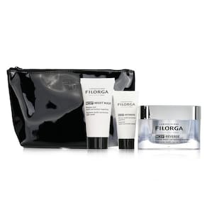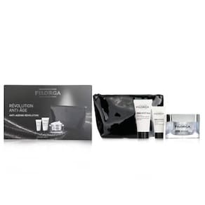 Características principais -------------------- - Solução antienvelhecimento abrangente: este conjunto de edição limitada inclui um creme multicorretivo supremo, uma máscara noturna e um soro intensivo, projetados para transformar a aparência da pele. - Tecnologia NCEF: todos os produtos apresentam NCEF, um poderoso complexo poli-revitalizante que melhora a textura da pele, reafirmando a aparência de linhas finas e rugas. - Uso versátil Ideal para indulgência pessoal ou reflexão Presente completo, este conjunto oferece uma experiência completa de cuidados com a pele. — Adequado para viagens: vem com uma bolsa de cosméticos chique, perfeita para levar seus itens essenciais para a pele em qualquer lugar. - Benefícios multiuso: cada produto combate vários sinais de envelhecimento, garantindo cuidados abrangentes para uma tez jovem e radiante. Ficha técnica -------------------- - Marca: Filorga - O conjunto contém: 1 creme multicorreção NCEF Reverse Supreme (50 ml), 1 máscara noturna NCEF (15 ml), 1 sérum multicorretivo Supreme Intensive NCEF (7 ml), 1 bolsa de cosméticos preta - Tipo de produto: conjunto de presentes antienvelhecimento para a pele - Público-alvo: Adequado para todos os tipos de pele Eleve sua rotina de cuidados com a pele com o conjunto de presentes de edição limitada Filorga Anti-Ageing Revolution. Esta coleção luxuosa combina formulações poderosas para combater os sinais visíveis do envelhecimento, como perda de elasticidade, linhas finas e embotamento. O creme multicorretivo NCEF-Reverse Supreme, enriquecido com uma mistura potente de ingredientes ativos, trabalha para restaurar o brilho juvenil da pele. Combine-o com a máscara Ncef-Night, que hidrata e revitaliza durante a noite, e o Sérum Supreme Intensive NCEF para um impulso extra de nutrição. Seja para se presentear ou presentear um ente querido, este conjunto promete resultados excepcionais para uma tez mais suave e luminosa.