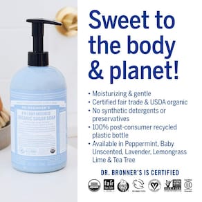 Dr. Bronner's Os sabonetes Baby Unscented Pure-Castile são suaves e suaves, especialmente formulados para a pele sensível do bebê! Completamente seguro e não tóxico, sem detergentes sintéticos ou conservantes — usamos os melhores ingredientes orgânicos! Perfeito para o corpo-cabelo-mãos-pés do bebê. Como todos os sabonetes verdadeiros, nossos sabonetes de castela pura sem perfume para bebês não são livres de rasgos, então mantenha fora dos olhos! Dilua para lavar toda a casa e lavar roupas — crie um ambiente livre de tóxicos para o seu bebê! Este conjunto de presente para bebês inclui: Sabonete de açúcar orgânico (680 g), bálsamo mágico orgânico (59 ml), sabonete líquido de castela pura (227 g) e sabonete em barra (142 g). O sabonete mais suave para o bebê, você e a mãe Terra! Tudo em um! - ESTE CONJUNTO DE PRESENTE INCLUI: Os produtos sem perfume Dr. Bronner's Baby são para bebês e pele sensível. O conjunto de presente inclui: Sabonete de açúcar orgânico (680 g), bálsamo mágico orgânico (59 ml), sabonete líquido de castela pura (227 g) e sabonete em barra (142 g). - Bom para o seu corpo e para o planeta: os sabonetes líquidos Dr. Bronner's são totalmente biodegradáveis e usam ingredientes veganos naturais que não representam ameaça ao meio ambiente. Nossos produtos e ingredientes nunca são testados em animais e são livres de crueldade. - SEM CONSERVANTES SINTÉTICOS, DETERGENTES OU AGENTES DE ESPUMA - Nosso sabonete em barra de castela pura é feito com ingredientes vegetais que você pode pronunciar — sem conservantes sintéticos, espessantes ou agentes espumantes — bom para o meio ambiente e ótimo para sua pele! - Nosso protetor labial é livre de crueldade e nunca testado em animais: os produtos e ingredientes da Dr. Bronner's nunca são testados em animais, então eles se qualificam para o logotipo do Leaping Bunny. Finalmente, um protetor labial que você pode obter totalmente! - Aromas celestiais: óleos essenciais puros e açúcar orgânico criam um aroma delicioso. Uma adição elegante ao seu banheiro e cozinha — Sabonetes de açúcar orgânicos são bons para lavar as mãos, rosto, corpo e cabelo! Siga com enxágue de cabelo cítrico para cabelos sedosos e suaves.