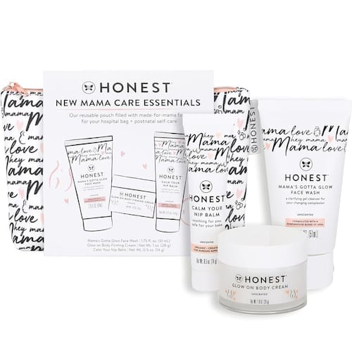Conjunto de presentes The Honest Company New Mama Care Essentials | Bolsa hospitalar indispensável | Nip Balm tamanho de viagem (0,5 onça), creme corporal Glow On (1 onça), sabonete facial Gotta Glow (1,75 fl oz), bolsa reutilizável — itens essenciais