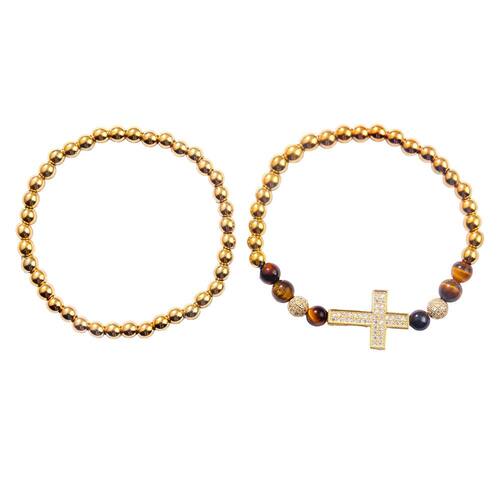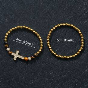 Tamanho: Diâmetro 8 cm, pulseira 6 cm Peso: 30 g Material: conjunto combinado de 2 peças em cobre/zircão — Inclui uma combinação elegante de uma pulseira de contas de ouro liso e uma pulseira cruzada adornada com detalhes em zircão e olhos de tigre. Cruz de zircão cintilante — apresenta uma impressionante peça central em cruz de zircão pavimentado que adiciona um toque luxuoso e simboliza estilo e força. Miçangas de cobre premium — Feitas com contas de cobre polidas douradas para uma aparência elegante e sofisticada que resiste ao desbotamento e manchas. Ajuste elástico e confortável — Construído com cordão elástico para caber facilmente na maioria dos tamanhos de pulso (diâmetro da pulseira de aproximadamente 6 cm; conjunto geral de 8 cm), sem necessidade de fecho. Escolha de moda versátil — perfeita para homens que buscam acessórios sofisticados para ocasiões casuais, noturnas ou formais, ou que adicionam luxo às roupas do dia a dia.