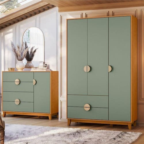 Renove seu espaço com elegância! Nosso Guarda-Roupa e Cômoda Sapateira Ipê combinam funcionalidade e estilo. Com gavetas equipadas com corrediças telescópicas, puxadores de ABS com acabamento dourado e detalhes inspirados na palha italiana, garantem sofisticação. As portas com dobradiças slow motion oferecem suavidade no fechamento. Composto por pés em madeira para um toque de requinte. Transforme seu ambiente hoje!" Possui Portas: Sim Possui Rodízio: Não Altura do Conjunto: 195 cm Ambiente: null Ambiente Principal: Quarto Cor: Cinamomo/Sálvia Informação Complementar: 1x Guarda-roupa 3 Portas e 2 Gavetas Ipê Cinamomo / Sálvia Largura: 120 cm Altura: 195 cm Peso: 90,1 kg Profundidade: 47 cm Necessita Montagem: Sim