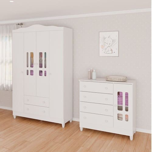 1x Guarda-Roupa de Bebê 4 Portas 2 Gavetas Ariel Branco Largura: 124,6 cm Altura: 198 cm Peso: 59,8 kg Profundidade: 39 cm Necessita Montagem: Sim