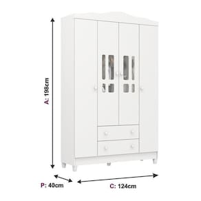 1x Guarda-Roupa de Bebê 4 Portas 2 Gavetas Ariel Branco Largura: 124,6 cm Altura: 198 cm Peso: 59,8 kg Profundidade: 39 cm Necessita Montagem: Sim