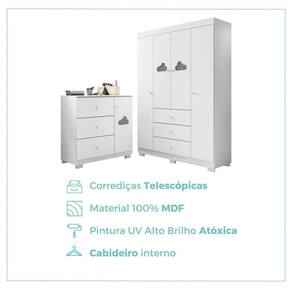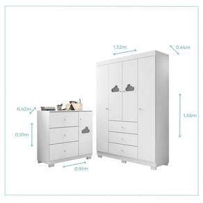 Este lindo Dormitório Ane vai encantar ainda mais o seu ambiente. Projetado para acompanhar todo o desenvolvimento infantil, dispõe de um Roupeiro com 04 Portas e 03 Gavetas além de uma Cômoda com 01 Porta e 03 Gavetas. Produzido 100% em MDF e pintura UV Alto Brilho atóxica proporcionando mais qualidade e durabilidade ao produto. As Corrediças Telescópicas promovem um deslizamento suave, silencioso e muito mais resistente. Há também cabideiros inclusos que favorecem a organização e otimizam o espaço. É sem dúvidas o Conjunto Perfeito para compor o ambiente mais importante do seu bebê com conforto, segurança e delicadeza. Altura do Conjunto: 188 cm Ambiente Principal: Quarto Infantil Complexidade da Montagem: Média: pode ser montado por mais de uma pessoa e/ou necessite de maior conhecimento para montagem Cor: Branco Cor do Produto: Branco Escala de Brilho: Brilhante Manual de Especificação Técnica: https://cdn2.madeiramadeira.com.br/atributo/phoenix-baby/1280344-gr-ane-4-pta.pdf Manual de Montagem e Instalação: https://cdn2.madeiramadeira.com.br/atributo/phoenix-baby/1280341-gr-ane-4-pta.pdf Material Principal: MDF Medida de Cada Item: Guarda Roupa: 188cm x 132cm x 44cm Cômoda: 91cm x 91cm x 42cm Necessita Montagem: Sim Origem do Produto: Nacional Peso: 101.8 Pintura Atóxica: Sim Recomendações de Uso, Manutenção e Limpeza: Pano seco Sistema de Montagem: Parafusos Suporta Até (kg): 50