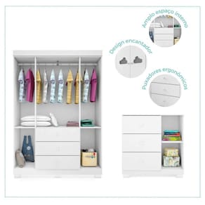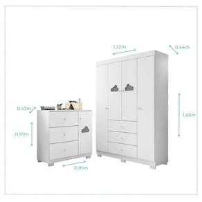 Conjunto de Quarto Infantil Guarda-roupas e Cômoda Ane Phoenix Baby Branco. Este lindo Dormitório Ane vai encantar ainda mais o seu ambiente. Projetado para acompanhar todo o desenvolvimento infantil, dispõe de um Roupeiro com 04 Portas e 03 Gavetas além de uma Cômoda com 01 Porta e 03 Gavetas. Produzido 100% em MDF e pintura UV Alto Brilho atóxica proporcionando mais qualidade e durabilidade ao produto. As Corrediças Telescópicas promovem um deslizamento suave, silencioso e muito mais resistente. Há também cabideiros inclusos que favorecem a organização e otimizam o espaço. É sem dúvidas o Conjunto Perfeito para compor o ambiente mais importante do seu bebê com conforto, segurança e delicadeza. Ean: 7909903287118