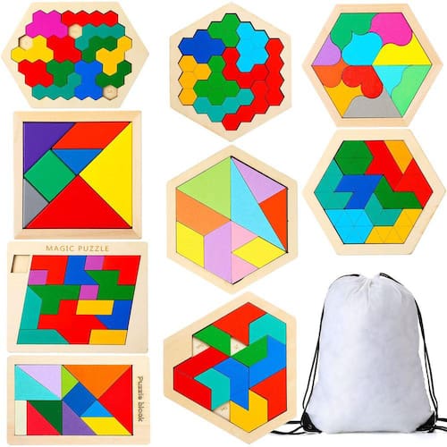 - Belo conjunto de quebra-cabeças: você receberá 9 peças de quebra-cabeças de madeira geométrica, incluindo quebra-cabeças hexagonais, 3 quebra-cabeças retangulares, 1 quebra-cabeça poligonal, que vêm com uma bolsa para guardar e carregar; uma variedade de quebra-cabeças de blocos de madeira proporcionará aos seus pequenos familiares possibilidades e diversão ilimitadas. Crie sua própria solução colocando peças e enchendo o rodapé, o que também pode manter as crianças ocupadas em uma longa viagem
