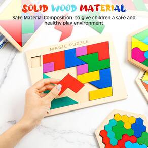 O quebra-cabeça de inteligência de madeira foi projetado com blocos de madeira em um padrão de formas geométricas que seus pequenos membros da família podem preencher no tabuleiro para completar o quebra-cabeça com diferentes soluções.