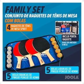 4 raquetes 10 bolas (5 brancas e 5 laranjas) 1 case de armazenamento O conjunto Family Set de tênis de mesa feito para toda família, ele inclui 4 raquetes, dez bolas (5 brancas e 5 laranjas), e uma maleta de armazenamento acessível que pode ser anexada sob a mesa. Ean: 4002560548103